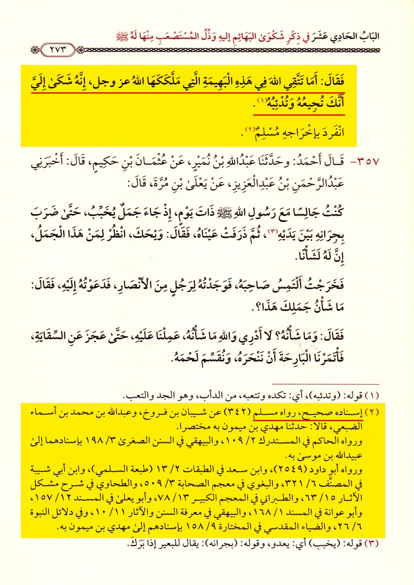 نكتفي بعرض أول رواية في الباب، وفيها أن جَمَلاً شكا إلى النبي صلى الله عليه وآله أن صاحبه يُجيعه ويُتعبه. 👇🏻