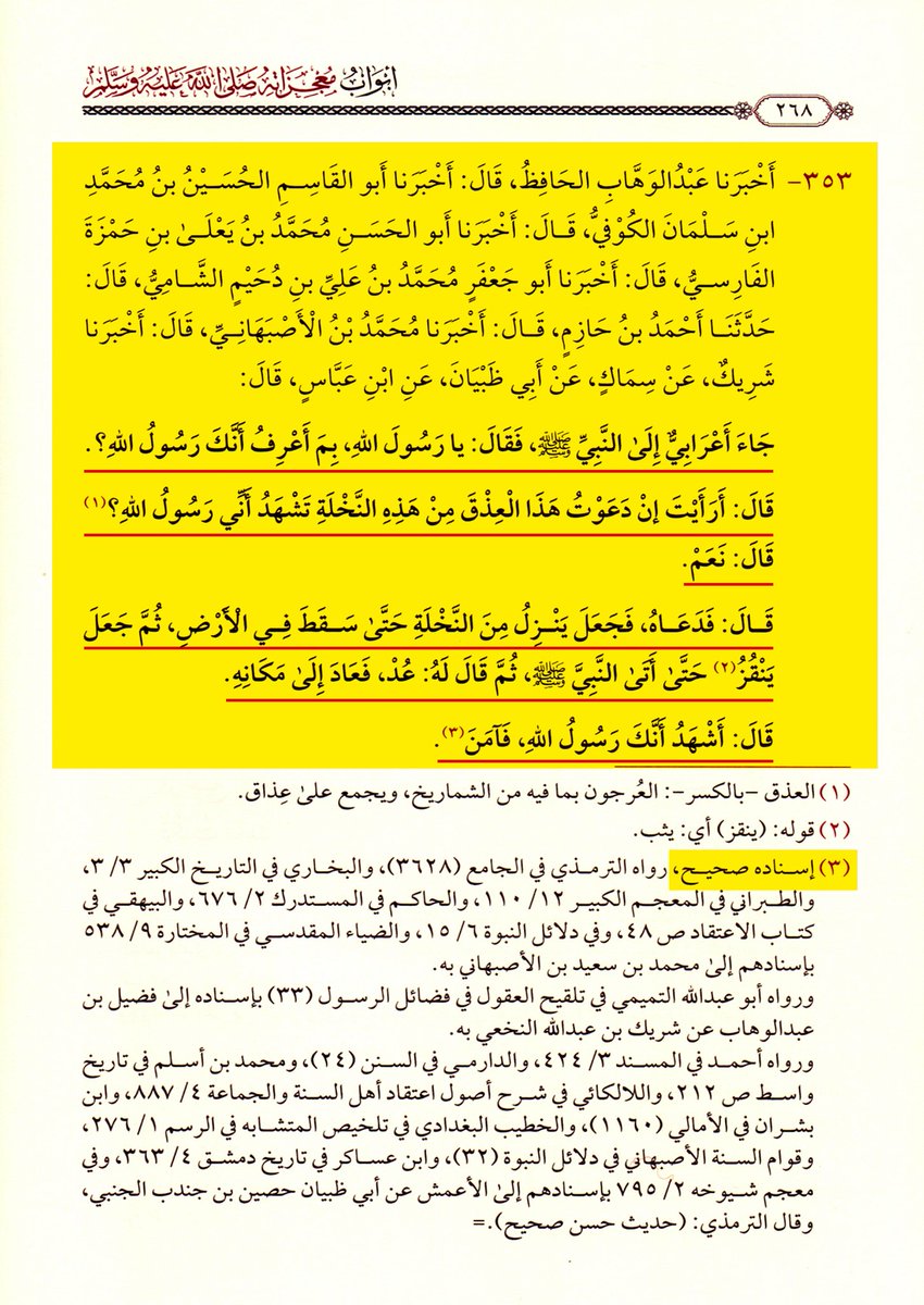 ٨- أورد ابن الجوزي رواية مفادها أن أعرابياً جاء إلى النبي صلى الله عليه وآله وسأله علامة يعرف بها أنه رسول الله، فدعا النبي صلى الله عليه وآله عِذْقَ نخلةٍ، فنزل العذق من النخلة، ثم أمره فعاد إلى مكانه، فقال الأعرابي: أشهد أنك رسول الله، فآمن. 👇🏻