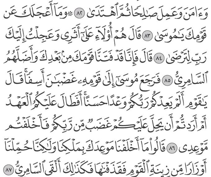 كان يعاتب موسى هارون كيف تركهم في ضلالهم؟ فقال هارون إن القوم استضعفوني وكادوا يقتلوني فلا تشمت بي الاعداء، ترك موسى هارون وسأل عن السامري الذي اضل القوم فظهر له السامري ووجهه يمتلأ بالرعب وأعترف أمام موسى بكل شيء وبكل أخطاءه التي وقعت منه وبالطريقه التي صنع بها العجل..