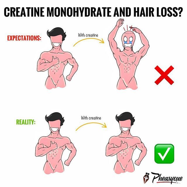 وجدت إحدى الدراسات التي أجريت عام 2009 أن مكملات الكرياتين مرتبطة بزيادة هرمون يسمى DHT ، والذي يمكن أن يساهم في تساقط الشعر. هناك حاجة إلى مزيد من البحث ، ولكن الأشخاص المعرضون لتساقط الشعر قد يرغبون في تجنب هذا المكمل ، لكن الأدلة الحديثة توضح أنه لا علاقة له بتساقط الشعر.
