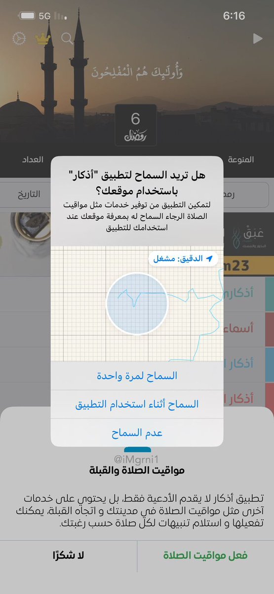• لو حبينا نظيف اوقات الصلاة .. نضغط على الصلاة المحدد بالسهم الاحمر بعد كذا بيجيك خيارات ، هل تريد السماح بتطبيق اذكار بإستخدام موقعك ؟ نضغط على ( السماح أثناء استخدام التطبيق )