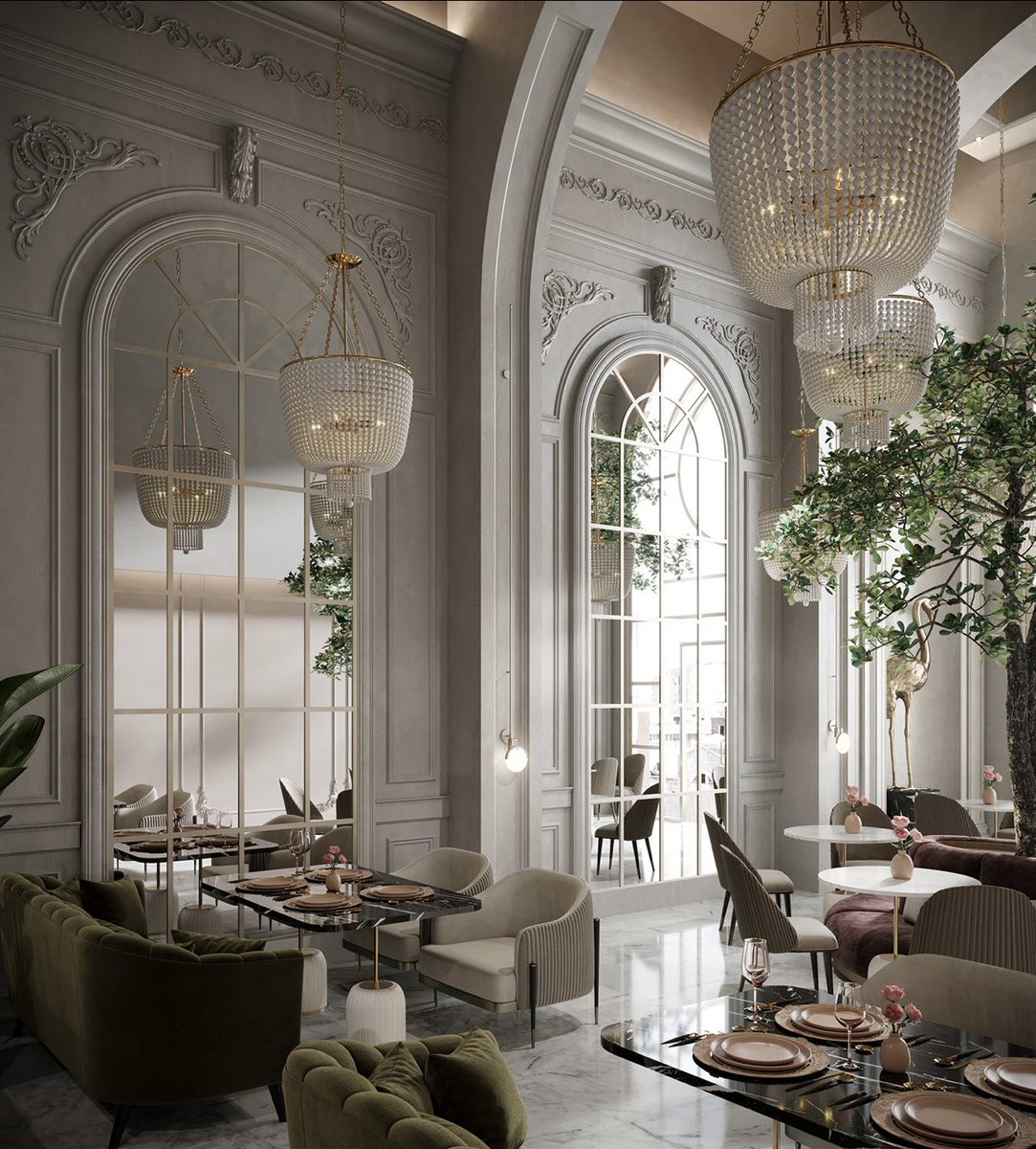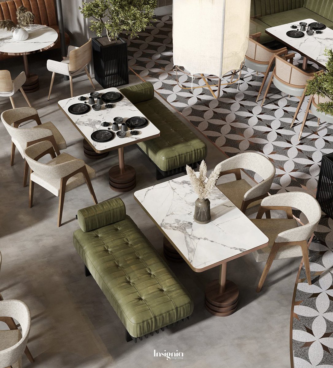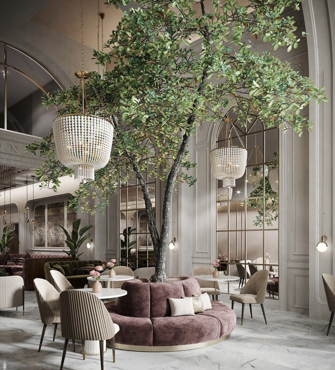 التوزيع الشعاعي في هذا التصميم وجعل نقطة المنتصف هي النقطة المحورية زادت من شراحة المكان ..