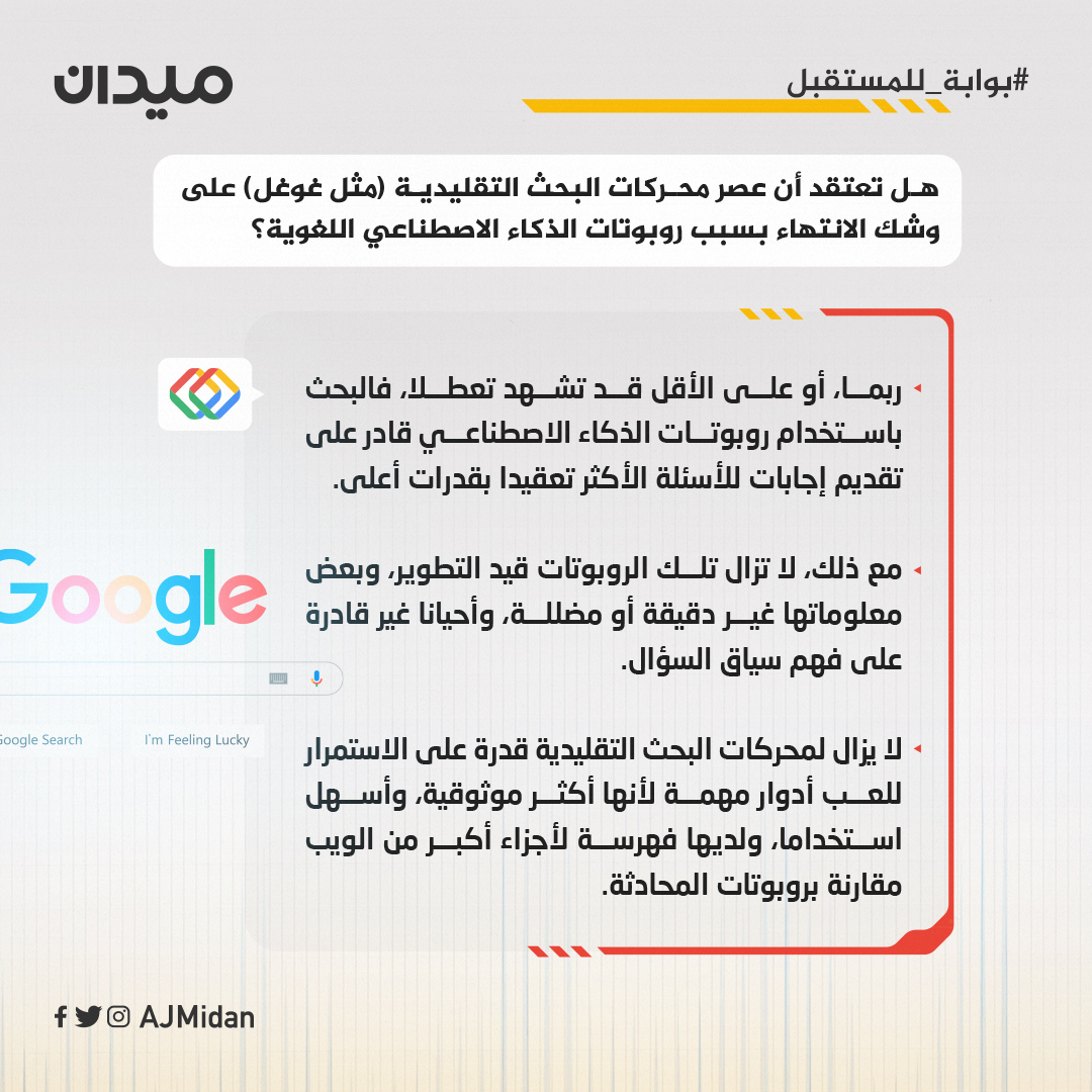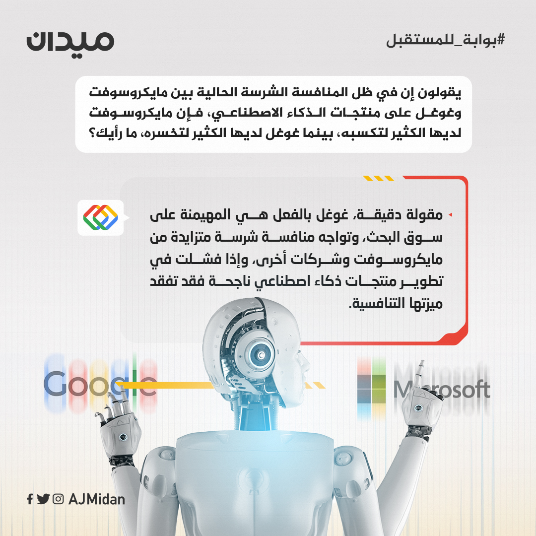 مؤخرا، أعلنت #غوغل عن إطلاق نسخة تجريبية بشكل محدود من روبوت المحادثة الخاص بها "بارد" (Bard)، توجهنا للروبوت "بارد" بأسئلتنا وأسئلة الصحافة الأكثر شيوعا حول المنافسة الشرسة التي يشهدها مجال الذكاء الاصطناعي حاليا، وكانت هذه إجاباته.