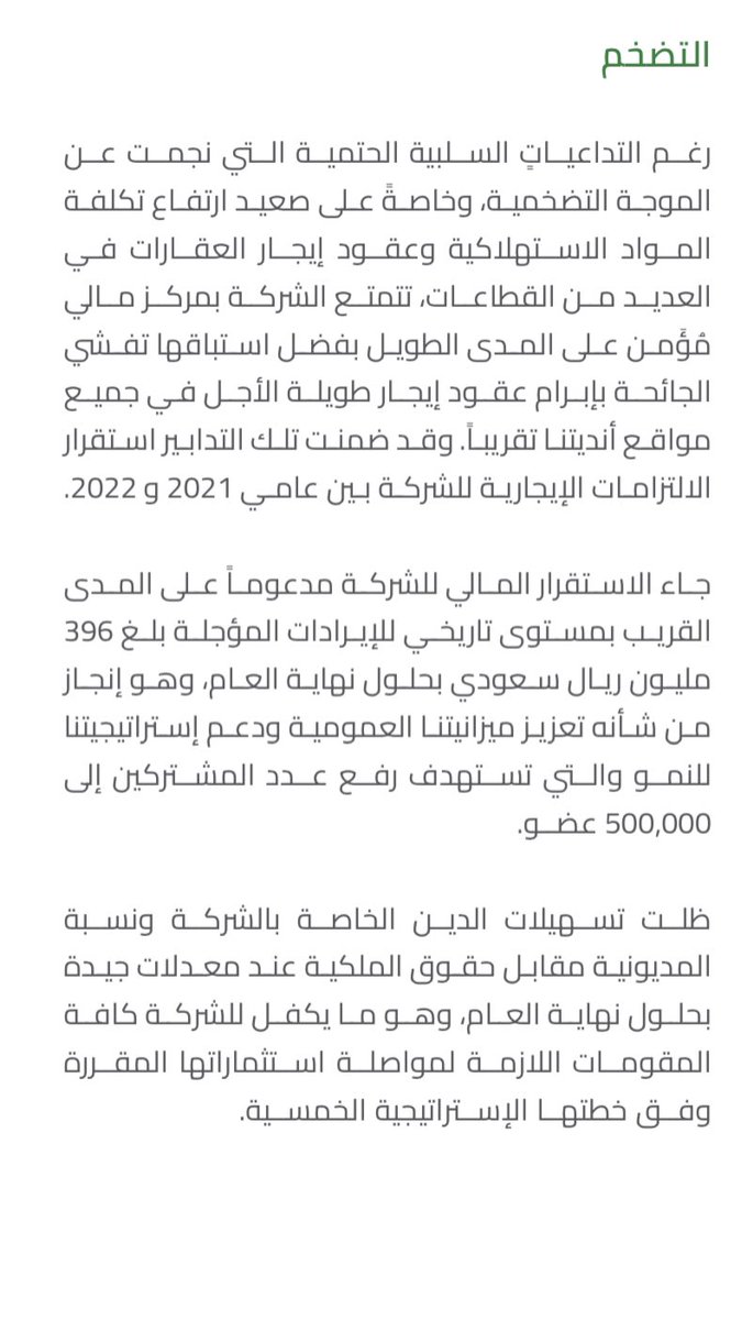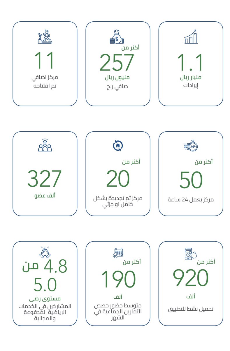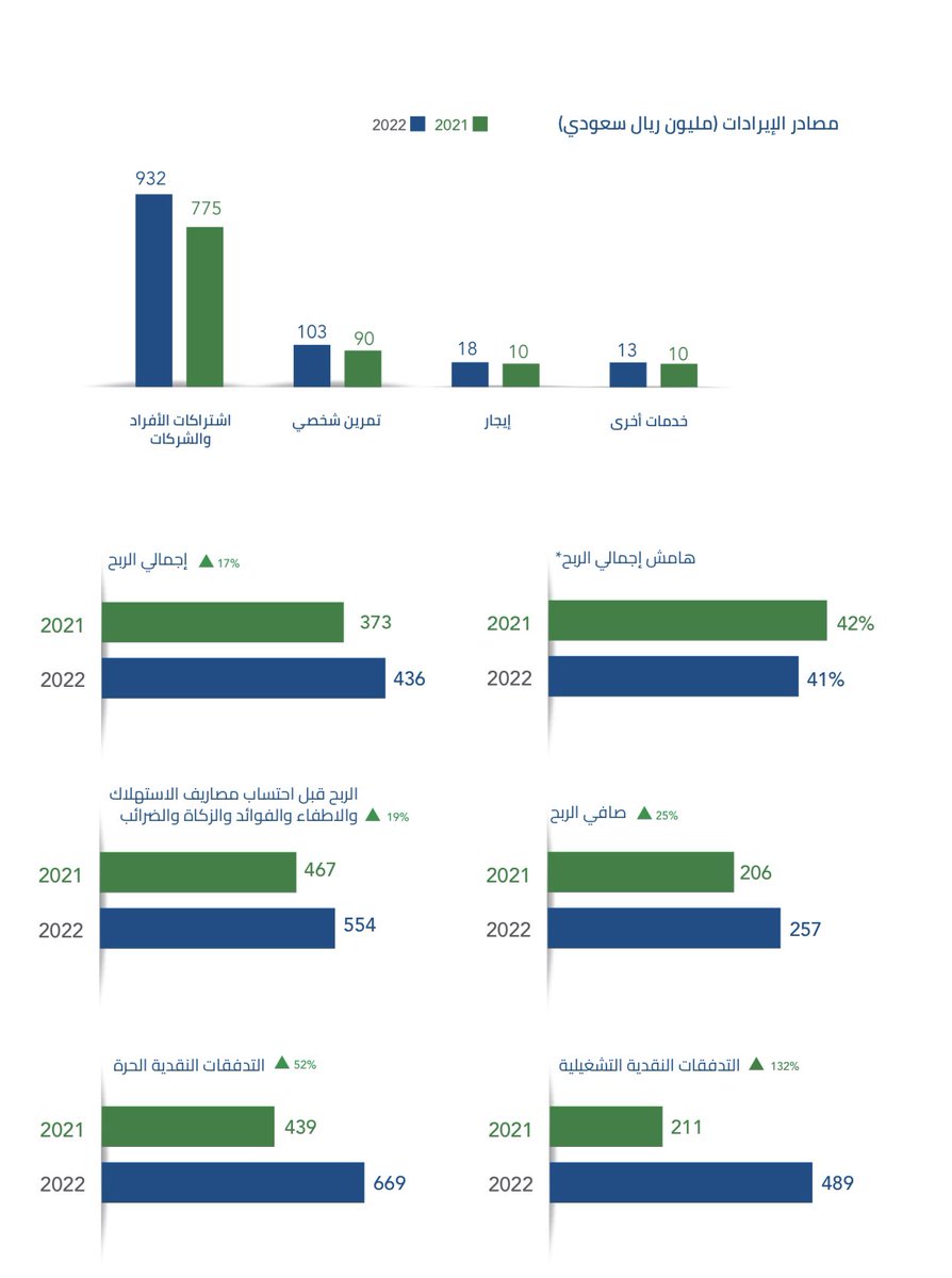 نظرة عامة: - تم افتتاح 11 فرع وتجديد 20 فرع - 327 ألف مشترك بنهاية 2022 - الإيرادات 1.1 مليار 85% من الاشتراكات