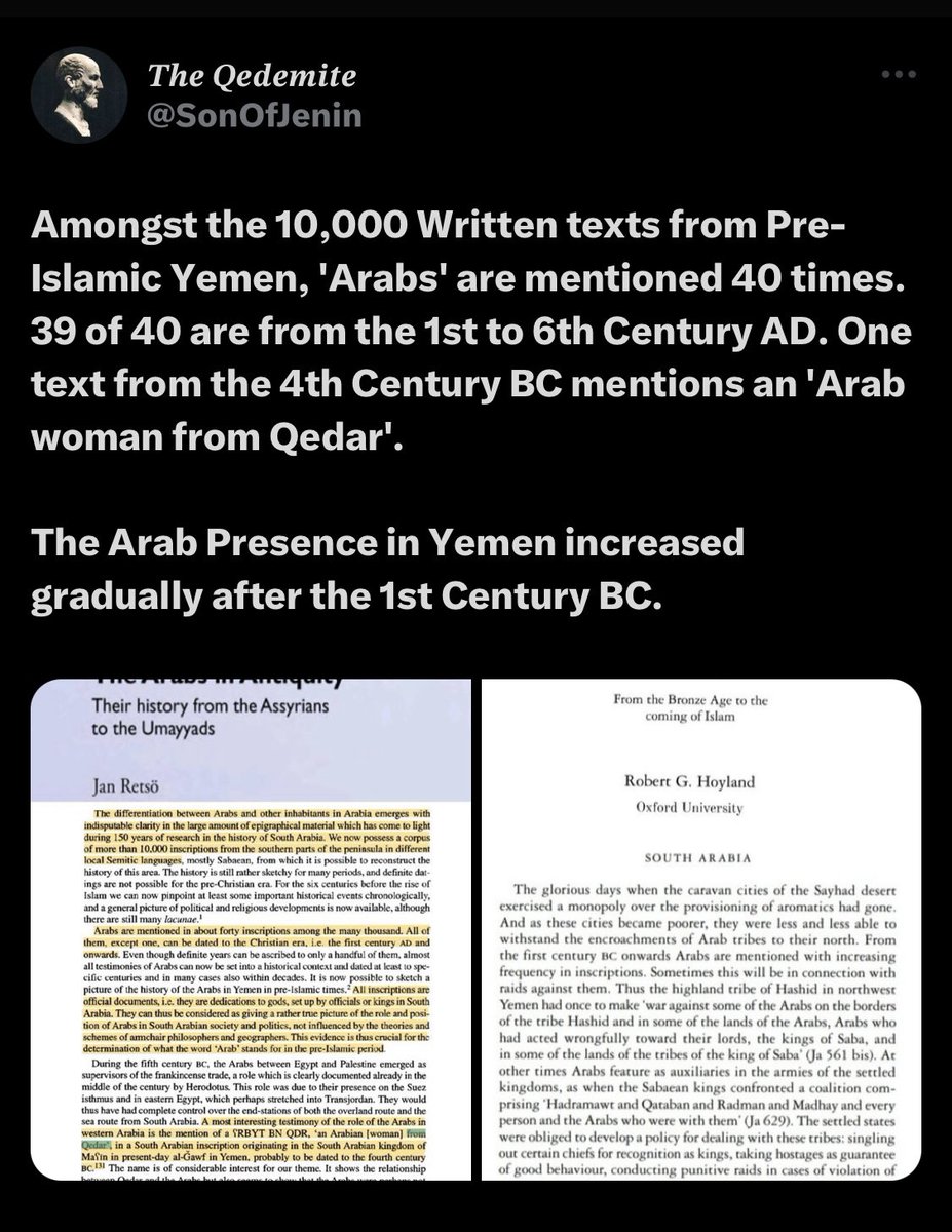 وأيضاً لا ننكر التأثير السبأي والحميري السياسي واللغوي على العرب ولكن ننكر كونهم كانوا عرباً أو أنهم كانوا أصل العرب من أساطير مابعد الإسلام.