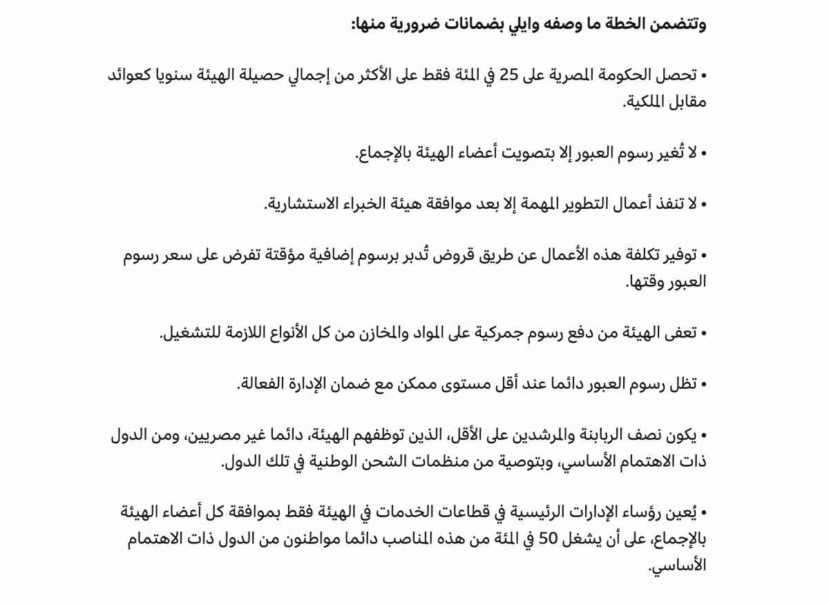 • إنشاء هيئة مصرية لها صفة قانونية، بالتفاوض بين الحكومة المصرية والقوى البحرية "ذات الاهتمام الأساسي"، تتولى إدارة القناة.