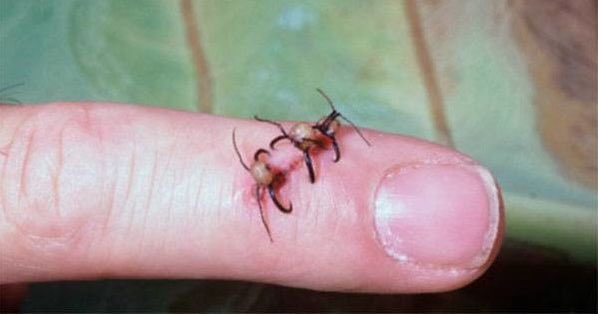 بمجرد التعرض للجرح يتم إلتقاط بعض النملات العسكرية المعروفين بقوة فكوكهم وإستخدام أجسامُم كخيط حي طبيعي عن طريق وضع فك النّملة علي بدايـة الجرح بغرض التشبث به ثم يتم شد الجزء الخلفي من النّملة لتكوين خيط وبذلك يتم فصل رأس النّمل عن باقي الجسم.
