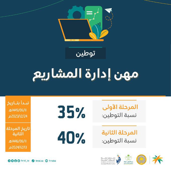 3️⃣ توطين مهن إدارة المشاريع بالتعاون مع #وزارة_الشؤون_البلدية_والقروية_والإسكان حيث سيكون تنفيذ القرار على مرحلتين المرحلة الأولى بنسبة %35 والمرحلة الثانية بنسبة %40 من إجمالي عدد العاملين في مهن إدارة المشاريع في المنشأة التي يعمل بها 3 عاملين فأكثر؛ وأن يكون الحد الأدنى للأجور 6000 ريال والمهن المستهدفة كالآتي :