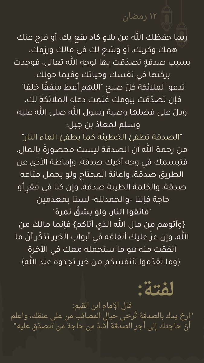 ربما حفظك الله من بلاءٍ كاد يقع بك، أو فرج عنك همك وكربك، أو وسّع لك في مالك ورزقك، بسبب صدقةٍ تصدّقت بها لوجهِ الله تعالى، فوجدت بركتها في نفسك وحياتك وفيما حولك.