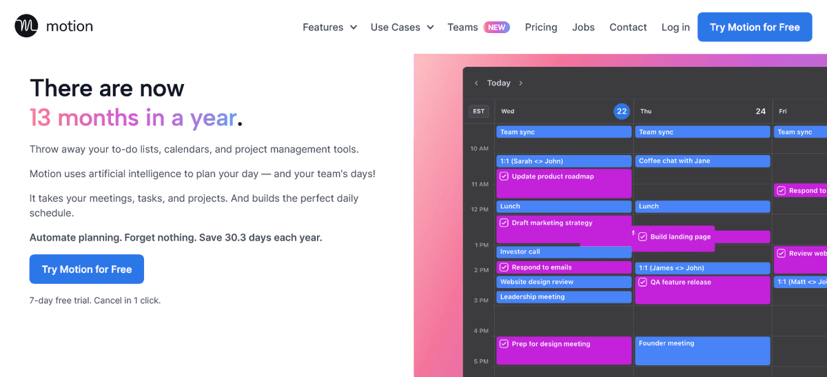 يمكن لأداة Motion المدعومة بالذكاء الاصطناعي تصميم جدول عمل تلقائيًا يتضمن المهام اليومية ومواعيد الاجتماعاتوالمشاريع. كما يمكنها وضع خطط للمشاريع والمساعدة في إدارة الاجتماعات. حيث يمكنك إدخال جميع المهام اليومية وستنظمها هذه الأداة في شكل جدول.