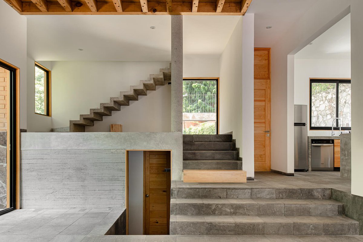 يسمح منحدر الأرض والشارع بإسقاط الطابق الأول فوق مستوى الشارع والتمكن من فتح المنزل وإطلالاته بحيث تشعر أنك محاط بالطبيعة من أي مكان.