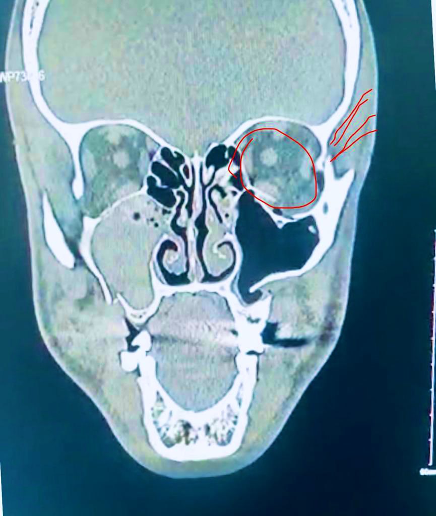 وتمت ارجاعهم الى مكانهم الطبيعي مع تثبيت بمشابك في منطقة الفك فقط. اما العين و العظام التي حولها فتم بطريقة و ضع عظم في مناطق الكسر و كذالك استخدام مادة لاصقة العظم. و تم هذا عن طريق شق داخلي من داخل العين.