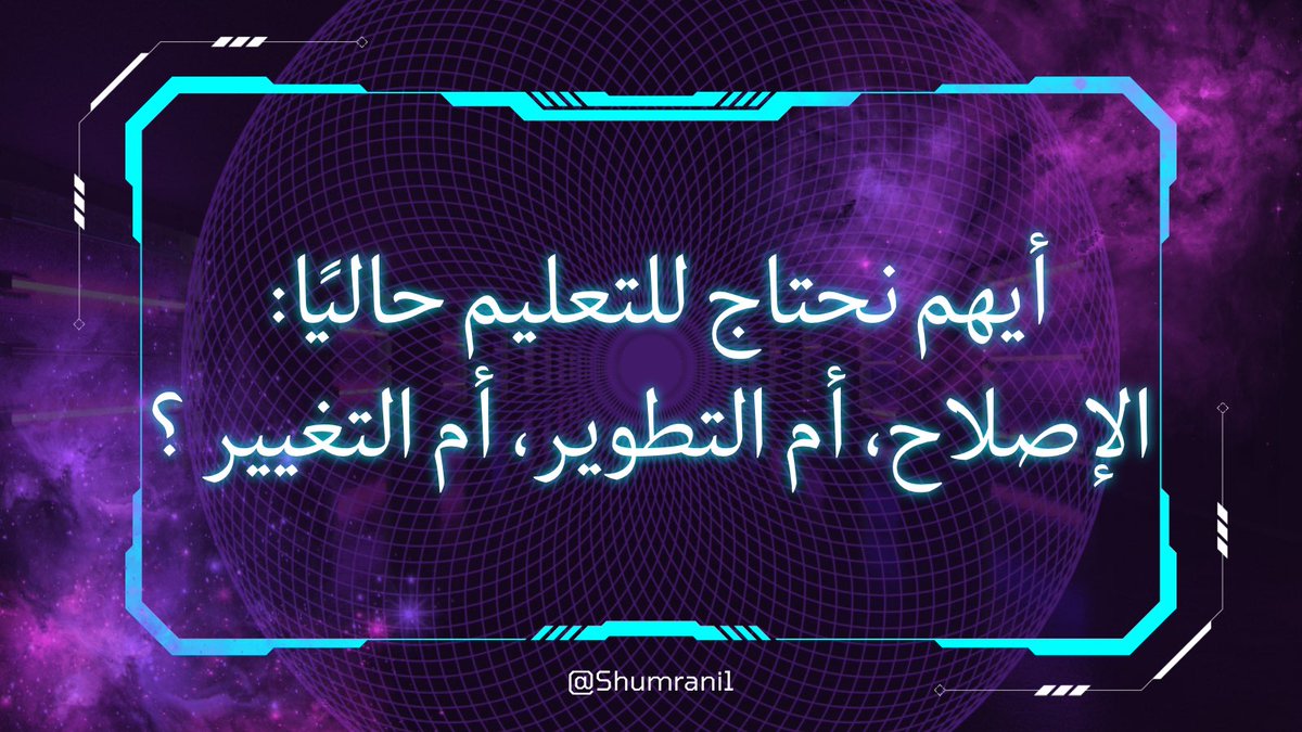 2️⃣ ينتشر حالياً على نطاق واسع في الأنظمة التعليمية في الدول التي تحتل مراكزاً متأخرة في ترتيب تعليمها بين الدول مفهوم إصلاح التعليم ومفهوم تطوير التعليم؛ وتدور الخطط والعمليات في فلك حلّ المشاكل القائمة وتحسين المناهج والممارسات الحالية، فهل لازلنا بحاجة إلى الإصلاح والتطوير؟؟؟