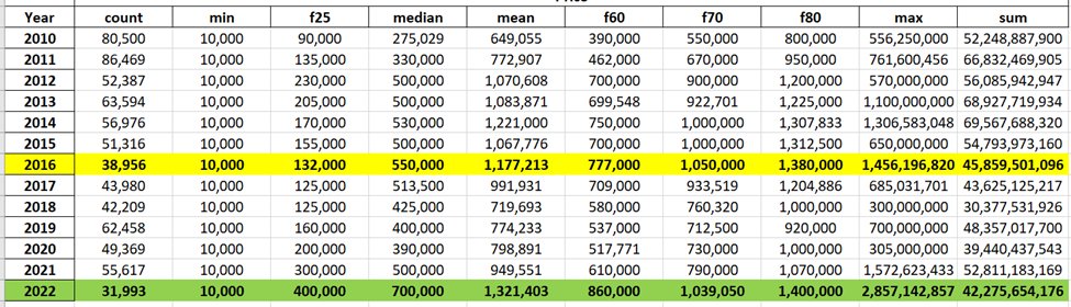 بمقارنة عدد الصفقات في هذا العام بالصفقات في الأعوام السابقة، يوضح الشكل أن عدد الصفقات نزل بنسبة 42.48% عن العام الذي قبله(2021)، وأقل من أقرب عام له (2016) بنسبة 17.87%، وبشكل عام فإن عدد الصفقات في عام 2022 هو الأقل منذ 13 سنة (31993 صفقة)