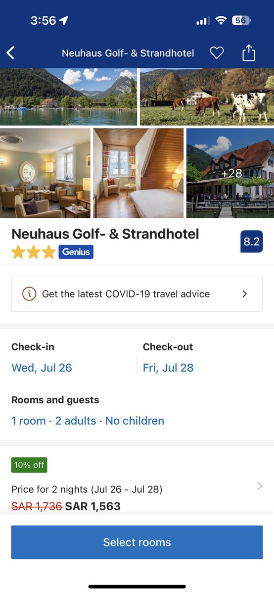 بعد ذلك توجه الى انترلاكن في سويسرا ولازم تطلع بدري لان الطريق بياخذ منك ٧ ساعات. مهم انك تشتري اي اغراض من النمسا بحكم ارتفاع الاسعار في سويسرا. انترلاكن معروفه بارتفاع اسعار السكن لذا اقترح تسكن في هذا الفندق لمده يومين وبيكلفك ١٦٠٠ ريال ليلتان.