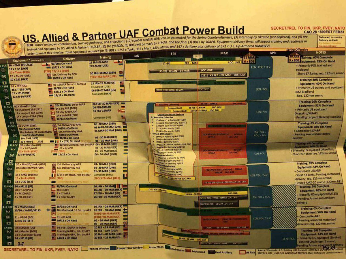 الوثائق تحتوي أيضا على معلومات حول 12 لواء يتم تشكيلها، بعضها يتم تدريبه وتزويده بالأسلحة من قبل الولايات المتحدة وحلف شمال الأطلسي (الناتو)، وتقول الوثائق إنهم "يحتاجون إلى أكثر من 250 دبابة و350 مدرعة".