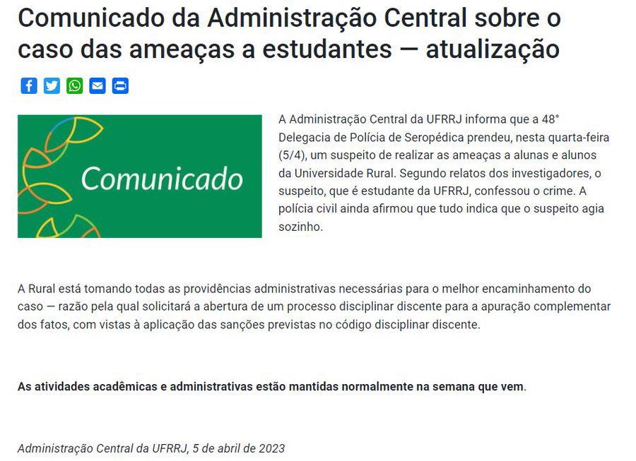 Além disso, o elemento ameaçou abusar sexualmente de uma colega e afirmou que promoveria um massacre na universidade “no dia 10”. As mensagens foram divulgadas nas redes sociais e a Direção do Instituto de Química da UFRRJ denunciou o caso à Polícia Civil.