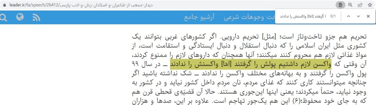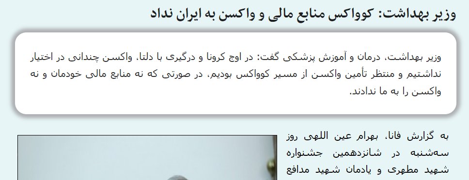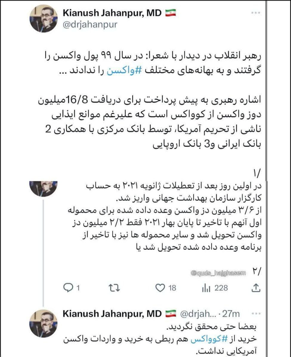 1- جهانپور، سخنگوی اسبق و. بهداشت، دیروز در توییتی به تشریح صحبتهای رهبری در دیدار با شاعران دربارهء واردات واکسن از طریق کوواکس پرداخت و از خلف وعدهء کوواکس (برنامهء تحت نظارت مستقیم بیل گیتس) خبر داد.