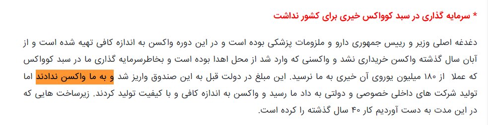5- فرض کنیم (فرض کنیم!) این مطلب (عدم دریافت واکسن از کوواکس) درست باشد، مسوولان توضیح دهند که برای بازگرداندن پول پرداختی، چه اقدامی کردهاند؟ بیتالمال مردم ارث پدریشان نیست که آن را به سادگی به باد دهند.