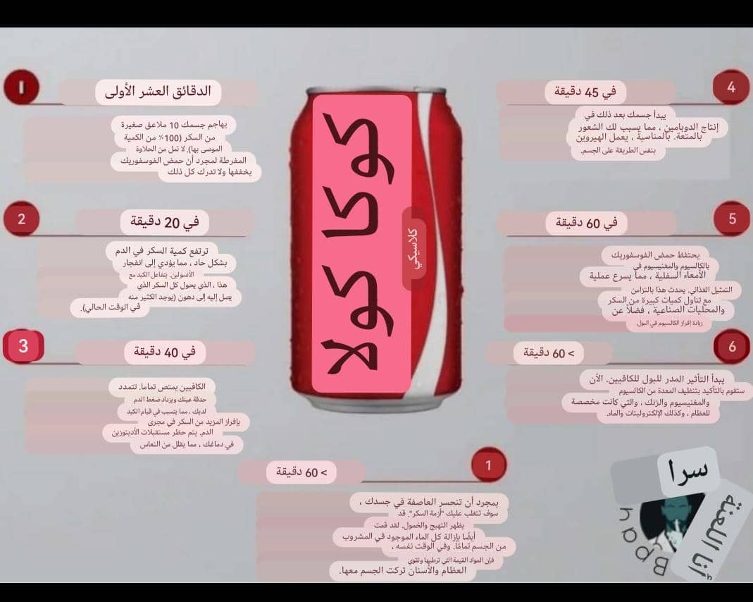 بعد ساعة من شرب المشروب ، يبدأ تحطم السكر ، مما يسبب التهيج والنعاس. سيخرج الجسم الماء من الكولا ، إلى جانب العناصر الغذائية الحيوية في البول.