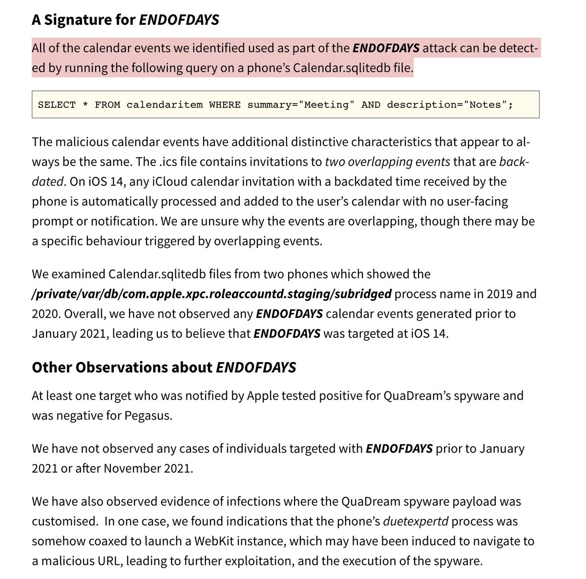 5/ We found clues of QuaDream using #ENDOFDAYS, a possible zero click exploit against #iCal on iOS 14 devices.