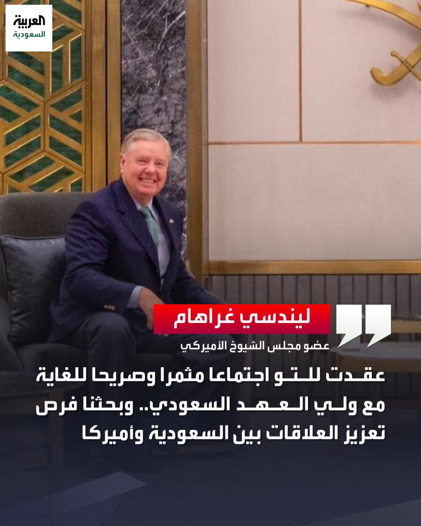 عضو مجلس الشيوخ الأميركي "ليندسي غراهام": عقدت للتو اجتماعا مثمرا وصريحا للغاية مع ولي العهد السعودي.. وبحثنا فرص تعزيز العلاقات بين #السعودية والولايات المتحدة