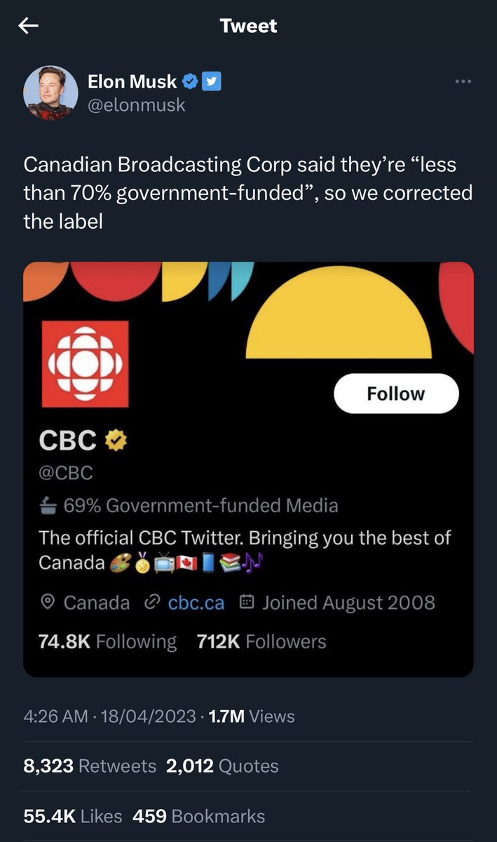 - قناة CBC الكندية تزعل و تسكر حسابها في تويتر بعد ما حط معزبنا على حسابهم بأنه ممول من الحكومة .