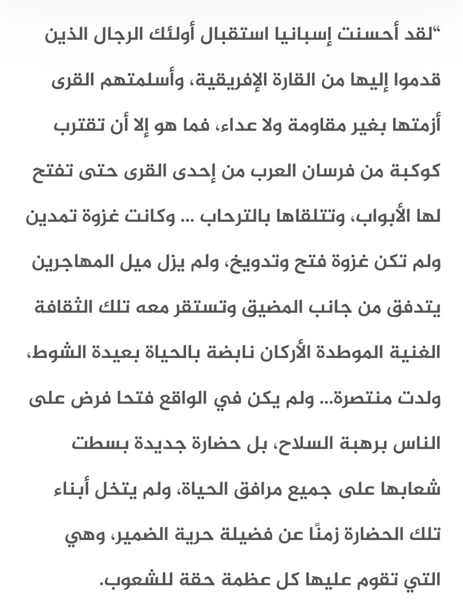 ولا نعرف شهادة لهذا العصر الذهبي أعظم ولا أصدق من ذلك الحنين الذي يذكره به غلاة الوطنيين الإسبان وكبار كتابهم، حين يلتفتون إلى ماضي بلادهم⤵️