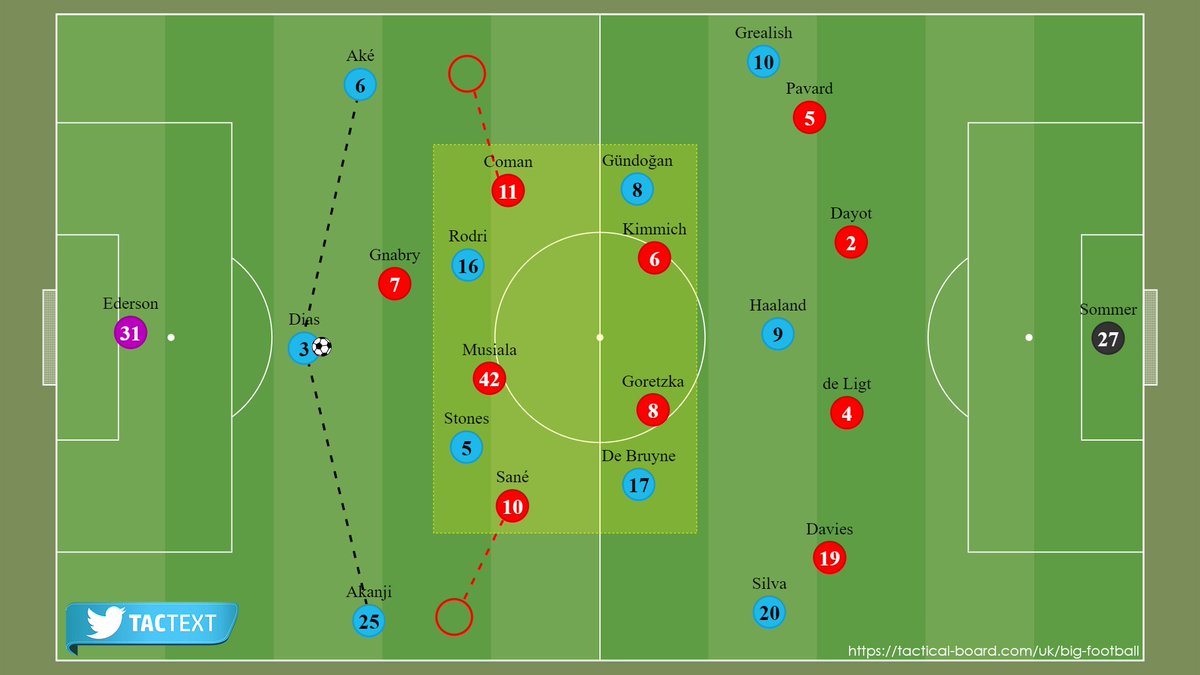 بسبب ذلك؛ قام #السيتي بتغيير شكله عند الضغط وذلك عبر التحوّل بصورةٍ أكبر لـ2-4-4 مع حرص دي بروين وهالاند على تغطية غوريتزكا وكيميتش Cover Shadow لمنح غاندوغان ورودري فرصة أكبر للتغطية على موسيالا وغنابري وبالتالي تقليل المساحة بينهم وبين خط الدفاع