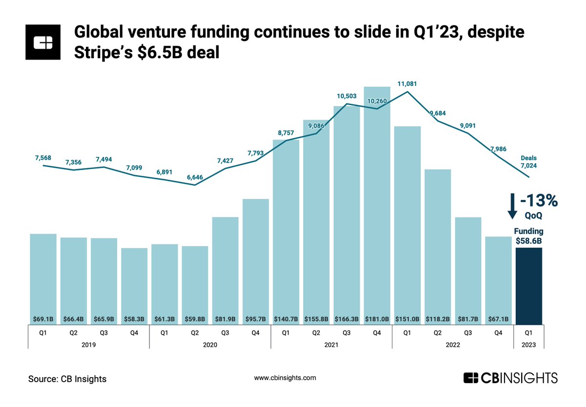 - استمر تمويل الشركات الناشئة في الانخفاض خلال الربع الأول 2023، حيث بلغ إجمالي تمويل الشركات الناشئة عالمياً 58.6 مليار دولار، بانخفاض بنسبة %13 بالمقارنة مع الربع الرابع 2022 ( 67.1 مليار دولار).