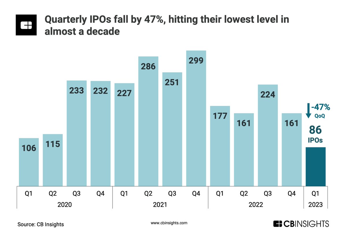 - الطرح الأولي للاكتتاب العام للشركات الناشئة على مستوى العالم خلال الربع الأول 2023، عوامل تشمل التضخم المستمر وارتفاع سعر الفائدة و ضعف أداء الشركات في سوق الأسهم وأزمة تعثر المصارف جميعها كان لها تأثير على عدد الشركات التي تم طرحها للاكتتاب العام الأولي خلال الربع الأول 2023.