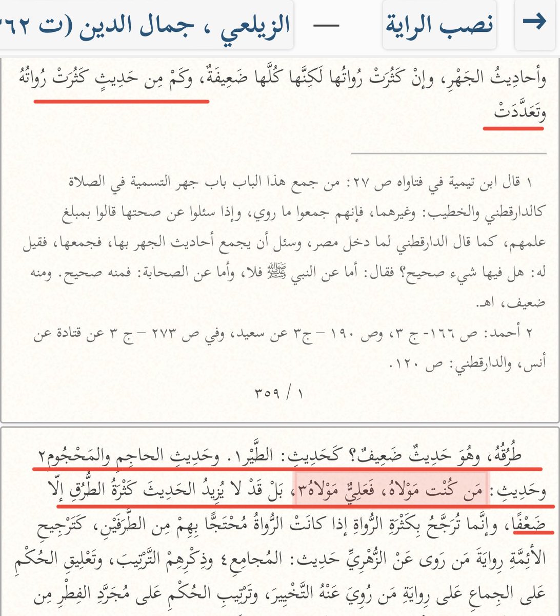 ٣. الزيلعي (ت ٧٦٢): وكم من حديث كثرت رواته وتعددت طرقه وهو حديث ضعيف.