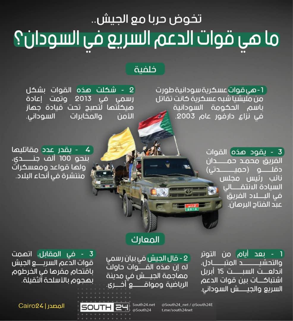 - "دقلو" علق يوم أمس عن تعليق سلاح الجو من خدمة القوات السودانية، وسيطر على عدة مقار ومطارات، لكن ليلة البارحة استعاد الجيش السوداني عدة مطارات، وهو اليوم يستخدم طائراته.
