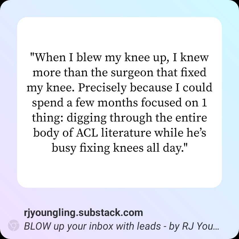 "عندما أصيبت ركبتي كنت على دراية بشؤون الركبة أكثر من الجراح الذي عالجها لي وذلك لأني أنفقت بضعة أشهر لا أركز إلا على شيء واحد وهو التهام كل ما نُشر علميًا عن موضوع رباط الركبة المُتصالِب الأمامي (ACL) في حين كان هو مشغولا حتى رأسه بعلاج الرُكب" اهـ