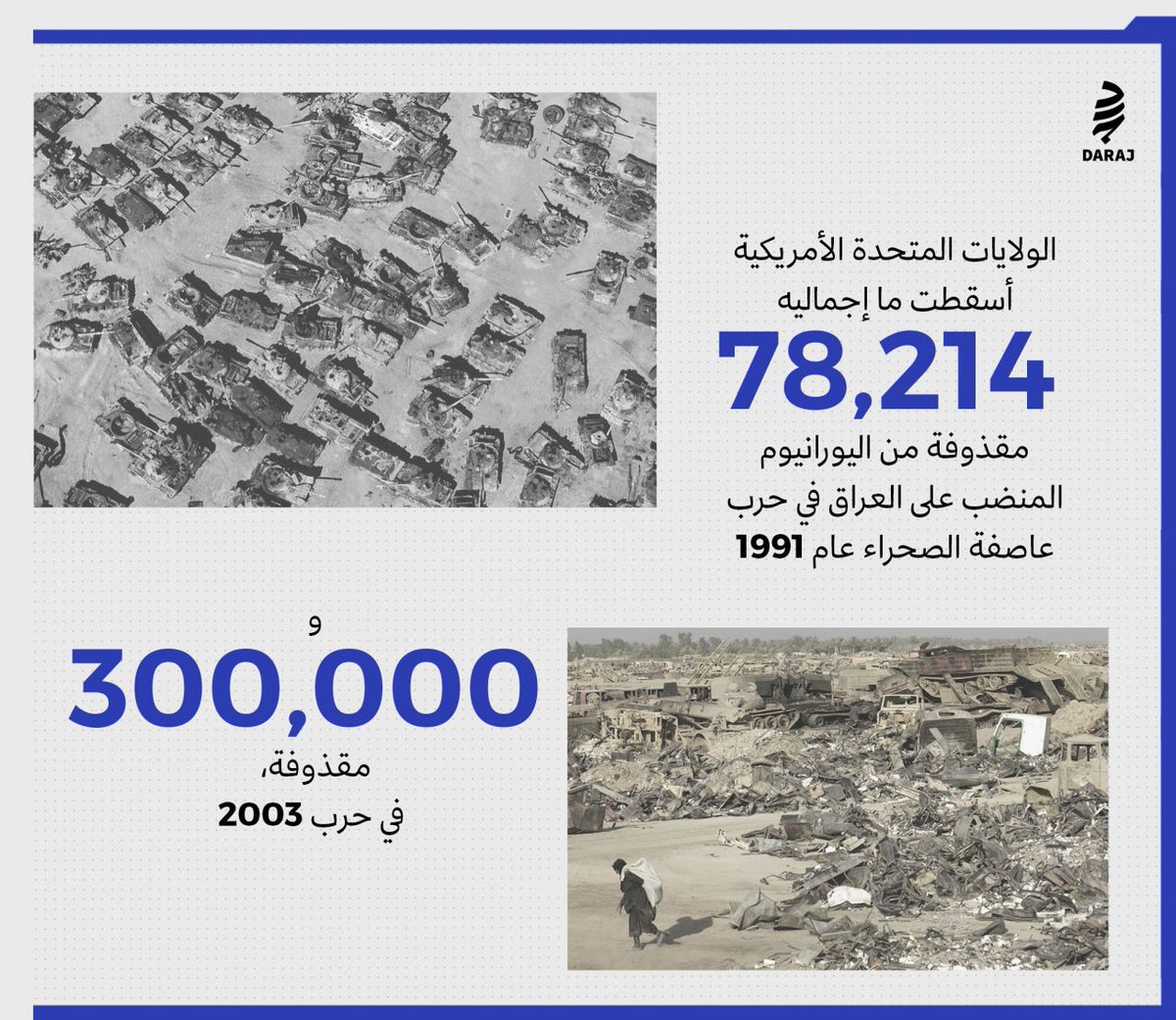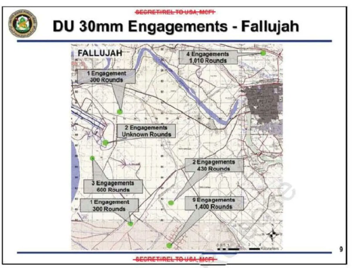 وتشير ذات المصادر أن ما استعمل على العراق من قذائف وإطلاقات اليورانيوم المنضب في عام 1991 وخلال ستة أسابيع قارب 940,000 إطلاقه عيار 30 ملم و14,000 قذيفة مدفع ودبابة من مختلفة العيارات، وهو ما يقارب 300 طن.