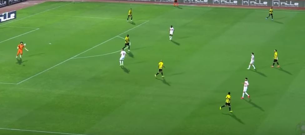 حيث دونجا يتحرك لاستلام الكرة من حمزة مع تحرك نداي للداخل من اجل تفريغ مساحة للمثلوثي