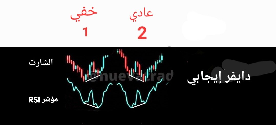 1- الخفي- على الشارت قمتين هابطه يقابلها على مؤشر RSI قمتين صاعده