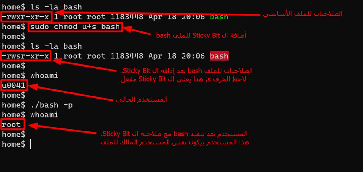 في أنظمة ال *nix فيه صلاحية اضافية على الملفات أسمها ال Sticky Bit. هذي الصلاحية تعطي المستخدم أنه ينفذ البرنامج بالنيابة عن المالك للملف