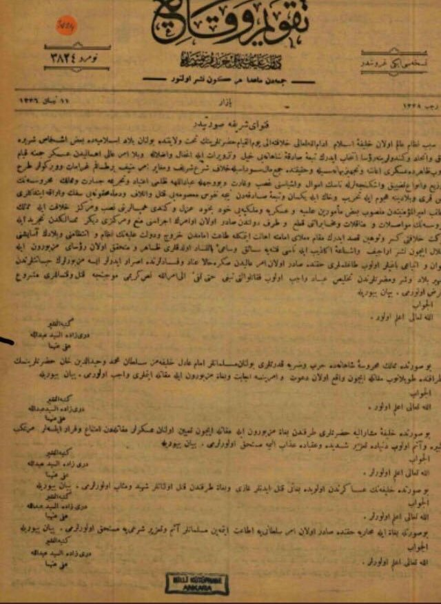 3⃣- Burası önemli. Bu üç emrin Osmanlı Devleti'nin resmî gazetesi durumundaki Takvim-i Vekâyi'de yayınlanması mücadeleyi durdurmanın hükümet ve sarayın resmî politikası olduğunu gösteriyordu.