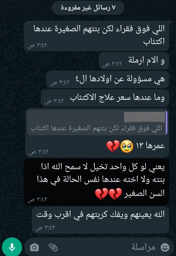 هذي عائله فقراء ماعندهم مقومات الحياه الاساسيه تخيلو بنتهم عمرها ١٣سنه شخصت باكتئاب ولا تقدر توفر سعر العلاج