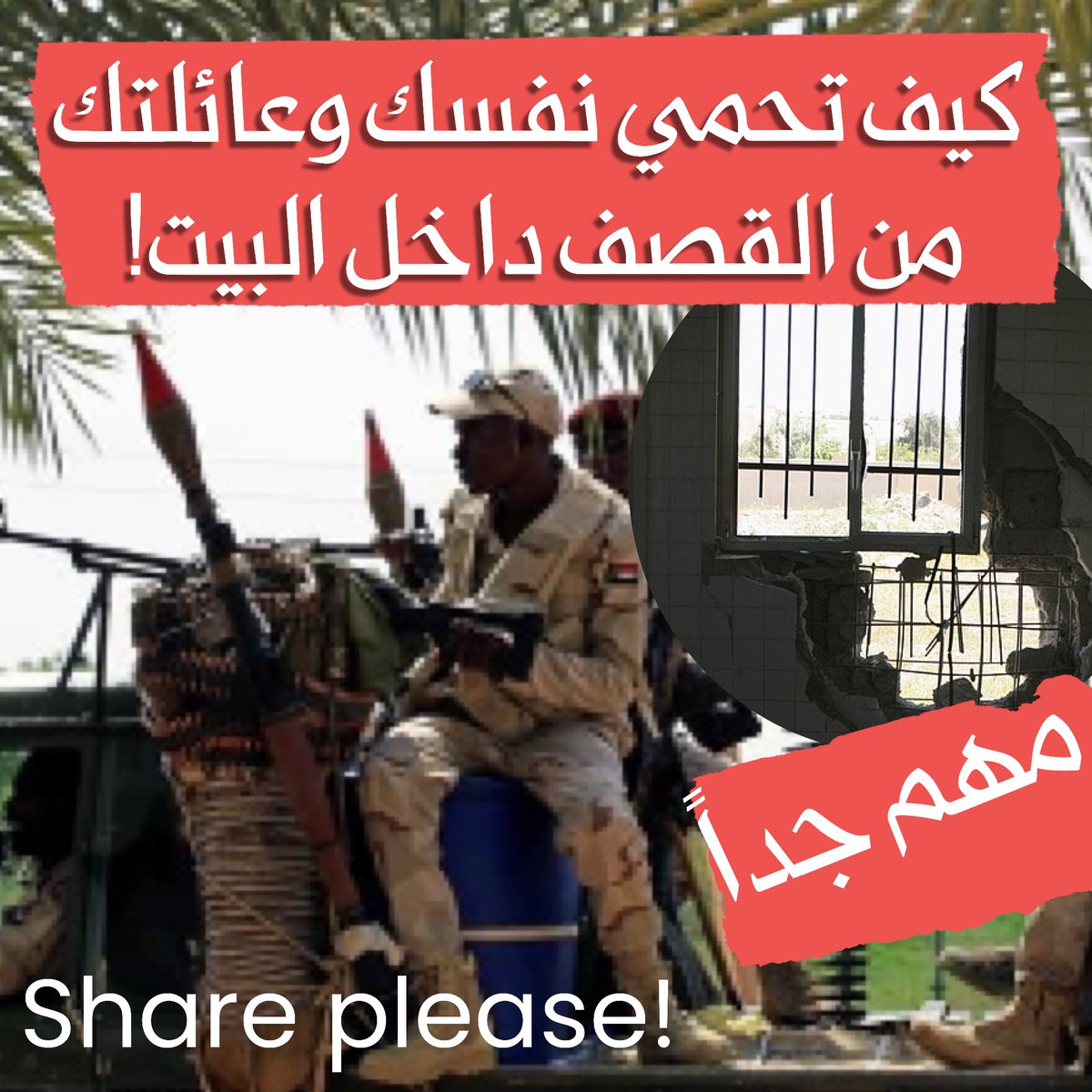 🛑 ممكن تقوو الشبابيك باللصاق أو أغطية بلاستيكية عشان تقلل مخاطر الإصابة من شظايا الزجاج المكسور. وممكن تختوا الدواليب والعفش قدام الشبابيك والأبواب. كحاجز ضد الرصاص وإطلاق النار، و كحماية إضافية للبيت. واتجنبوا الوقوف بالقرب من الشبابيك أو الأبواب.