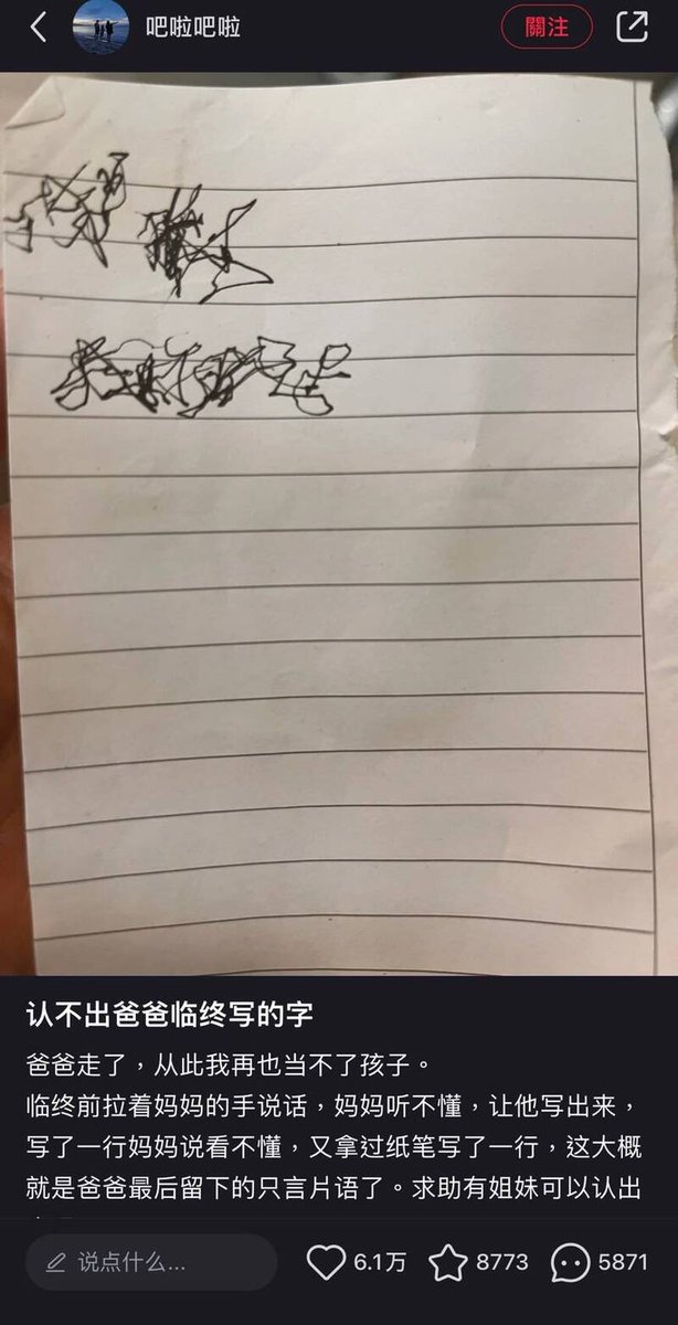 لذلك قررت طلب المساعدة من مستخدمي الإنترنت الآخرين وفي أقل من 24 ساعة قام احد مستخدمي الإنترنت بمساعدة الأسرة الحزينة من خلال فك رموز الملاحظة التي كتبها والدها وكانت عبارة عن تسعة أحرف صينية مما يعني:لا تحزنوا أريدكم أن تكونوا اقوياء😢