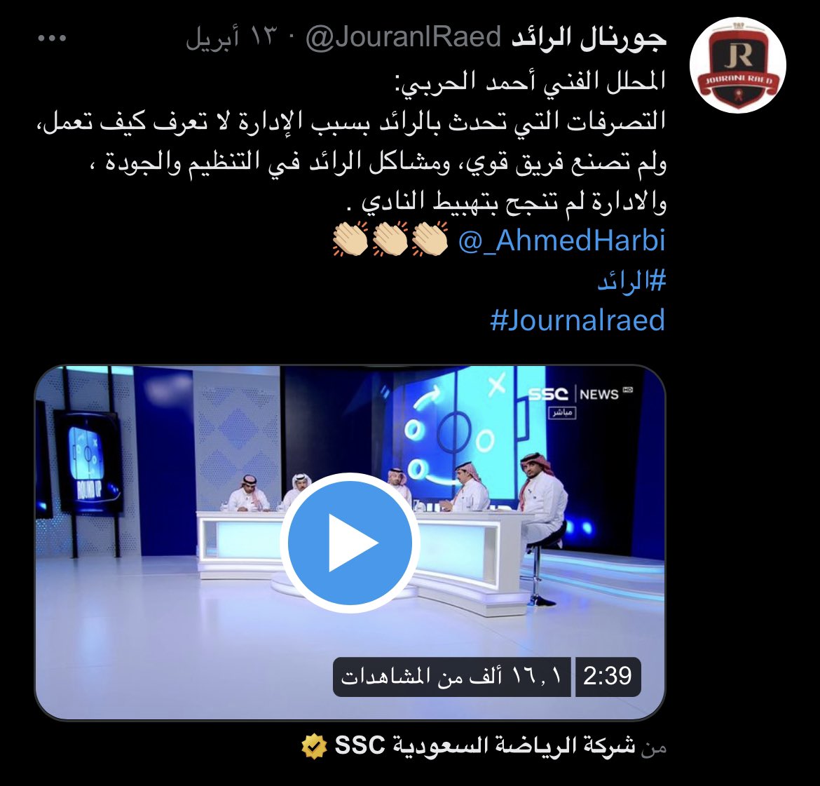- من أهداف رؤية 2030 هو رفعة ورُقي سمعة الكرة السعودية وفي #الرائد مع فهد المطوع لا نرى عمل يواكب هذه الرؤية .