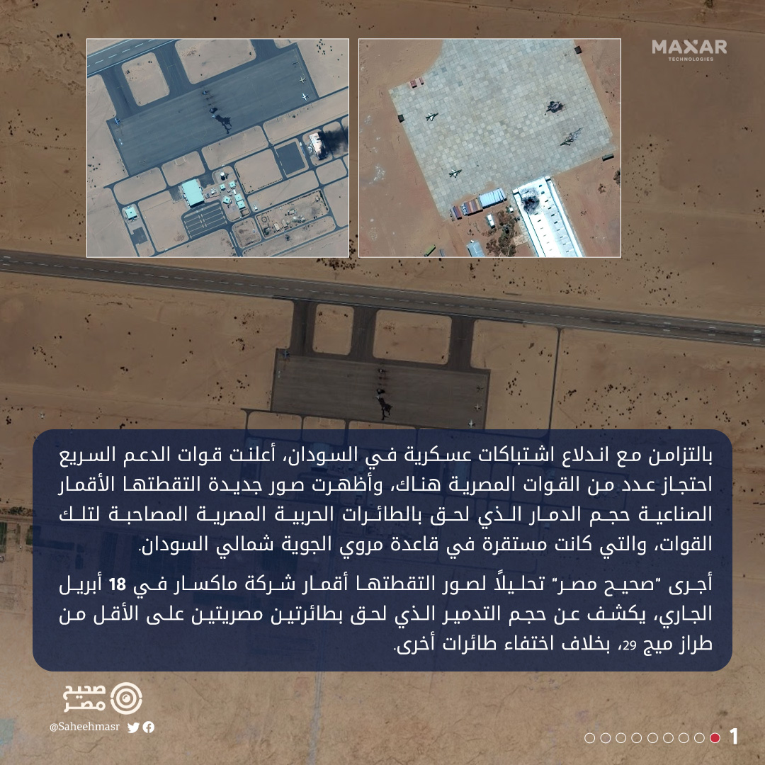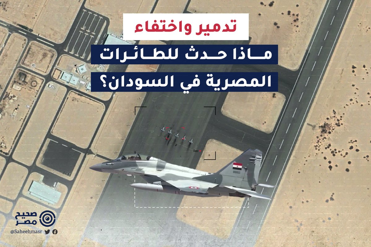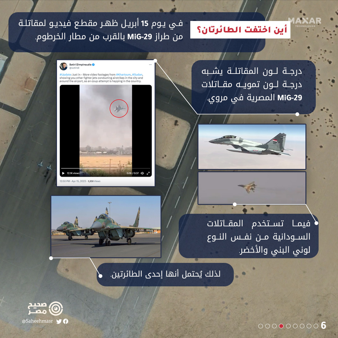 ✅ من المحتمل أيضا أن الطائرتين الأخرتين تقعان في حظيرة الطائرات بقاعدة مروي، وفقًا لصور متداولة لطائرتين مصريتين من طراز Mig-29، لم يتسن لنا التحقق من صحتها.