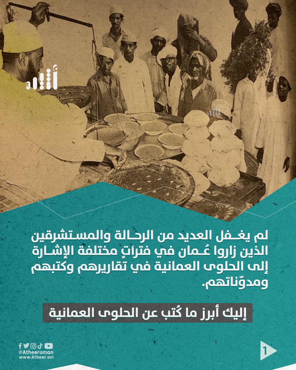 #أثير| لم يغفل العديد من الرحالة والمستشرقين الذين زاروا عُمان في فتراتٍ مختلفة الإشارة إلى الحلوى العمانية في تقاريرهم وكتبهم ومدوّناتهم.