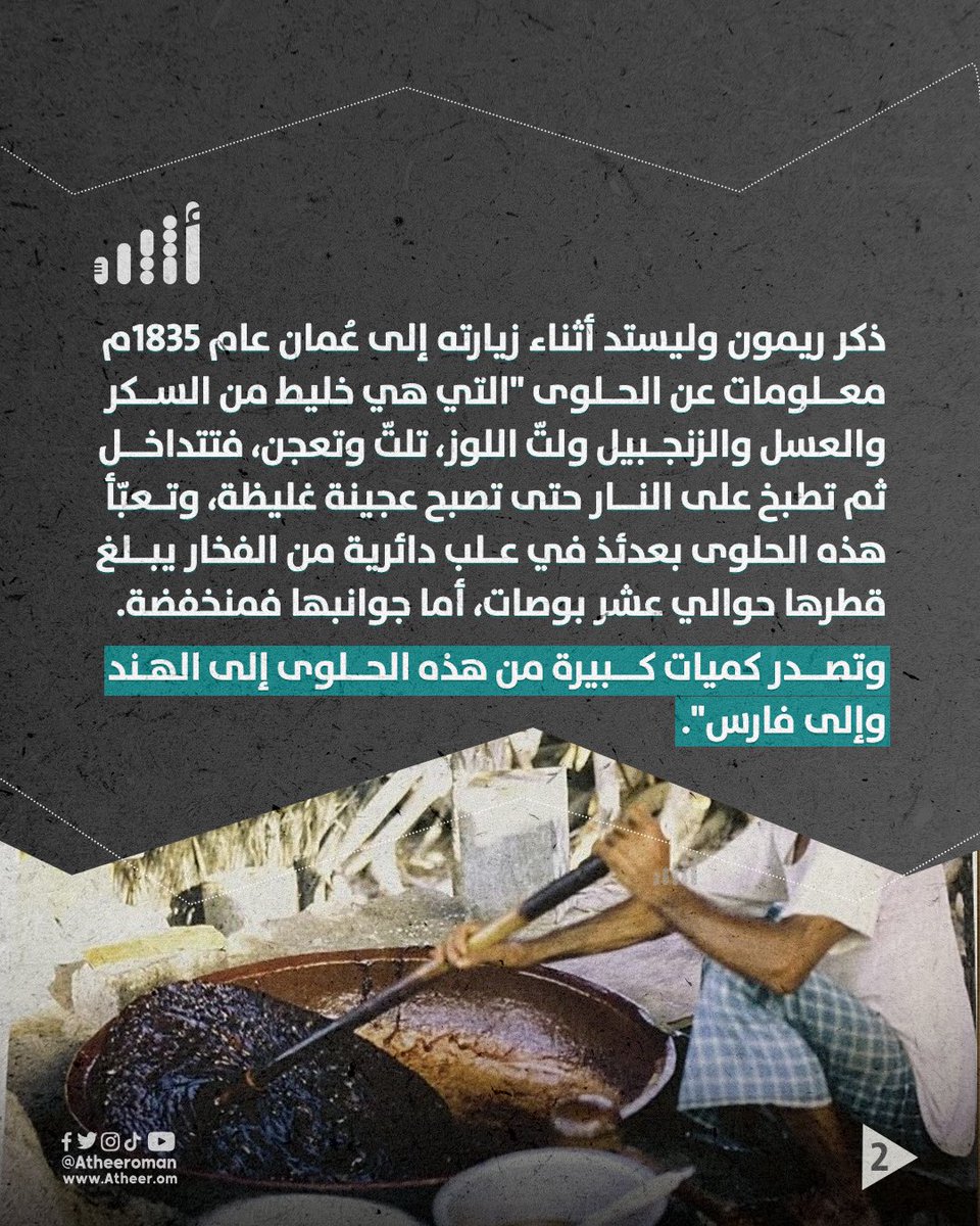 #أثير| ذكر ريمون وليستد أثناء زيارته إلى عُمان عام 1835م معلومات عن الحلوى "التي هي خليط من السكر والعسل والزنجبيل ولتّ اللوز، تلتّ وتعجن، فتتداخل ثم تطبخ على النار حتى تصبح عجينة غليظة، وتعبّأ هذه الحلوى بعدئذ في علب دائرية من الفخار يبلغ قطرها حوالي عشر بوصات، أما جوانبها…