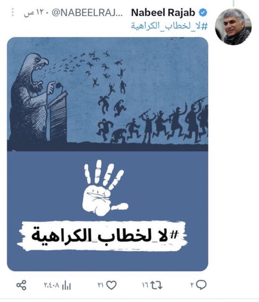 هذه حقيقة نبيل رجب الذي يروج لحملة #لالخطاب_الكراهية وهو الذي قاد قبل سنوات حرب خفية باردة ضد الأستاذ عبدالهادي الخواجة لأسباب يعرفها العديد من النشطاء يعود اليوم و يمارس هذا الدور الشرير مستخدما شهرته و علاقاته و نفوذه ضد شخصيات طيبة وصالحه وهذا غيض من فيض من ادواره الشريرة