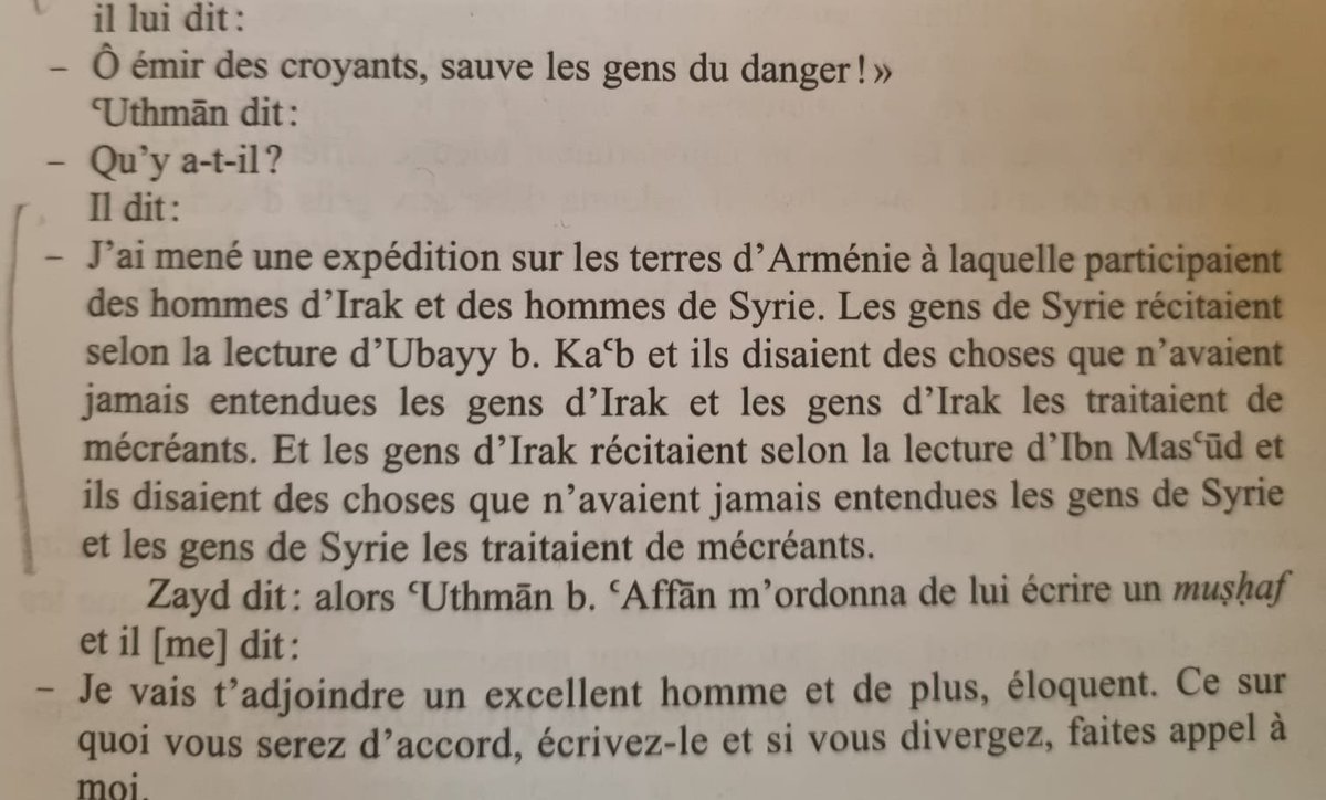 [...] en période de gestation et que sa forme définitive n'a certainement pas eu lieu sous 'Uthman. Cela montre également que c'est à une époque ultérieure que le Coran a pris une place de première importance dans la pratique religieuse des musulmans.