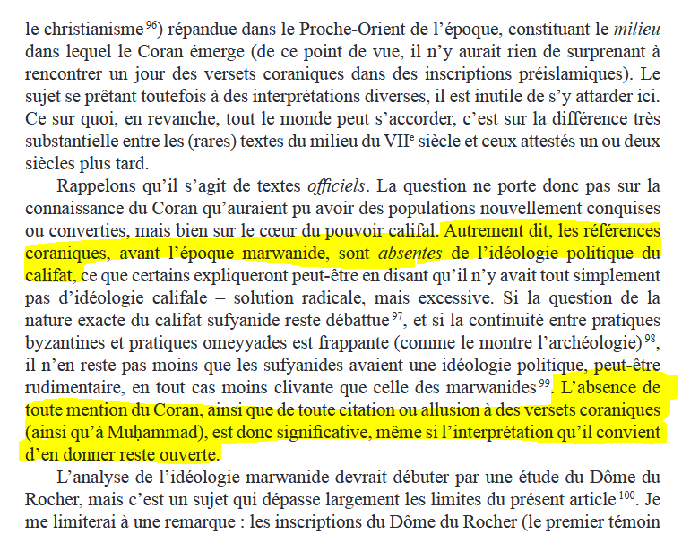 Évidemment, cela ne veut pas dire que tout le Coran date de l'époque marwanide. Certains textes qui composent le Coran peuvent être très anciens, d'autres composés beaucoup plus tardivement.