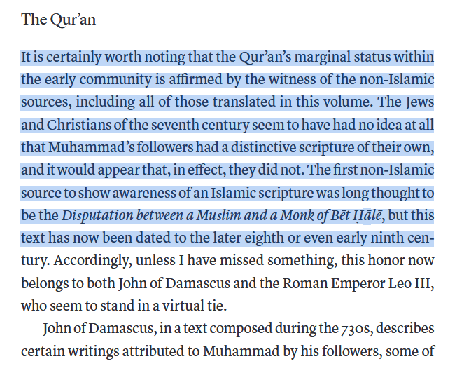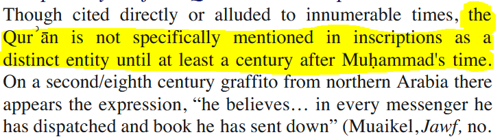 Il est difficile de prendre au sérieux les sources islamiques (d'ailleurs très tardives) qui nous disent qu'en 650, des copies du Coran avaient été distribuées un peu partout dans l'Empire alors même qu'aucune référence au Coran n'existe pendant la majeure partie du 7e siècle.